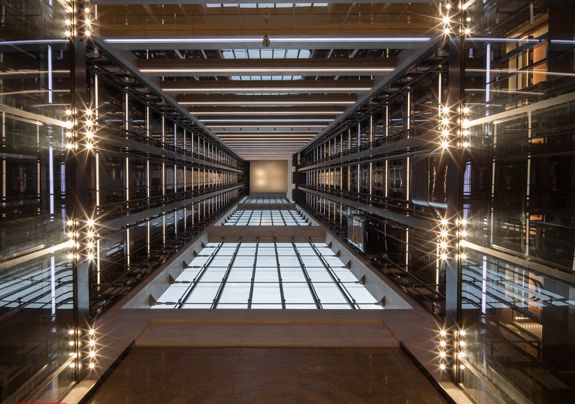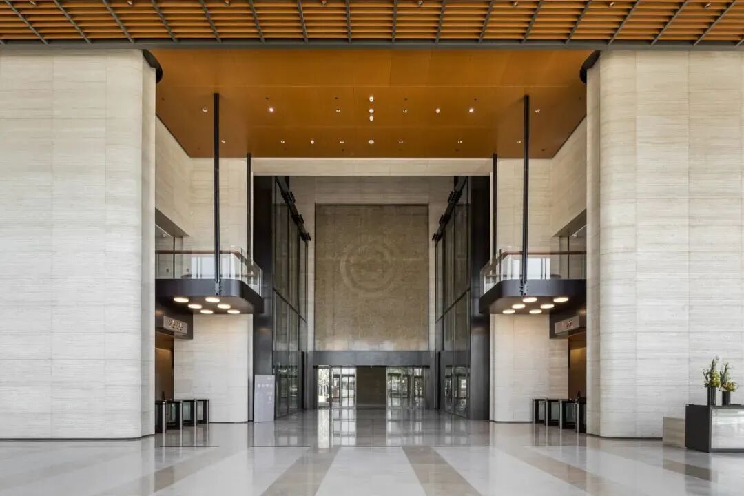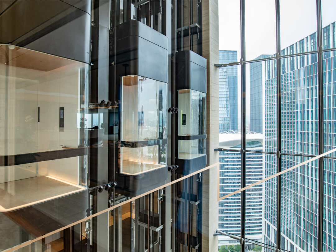 大堂内120米超高挑空中庭,以景造境。大厦15部通力电梯,两侧6部观光电梯直通到空中大堂,现代机械工艺风十足,仰视效果十分震撼。