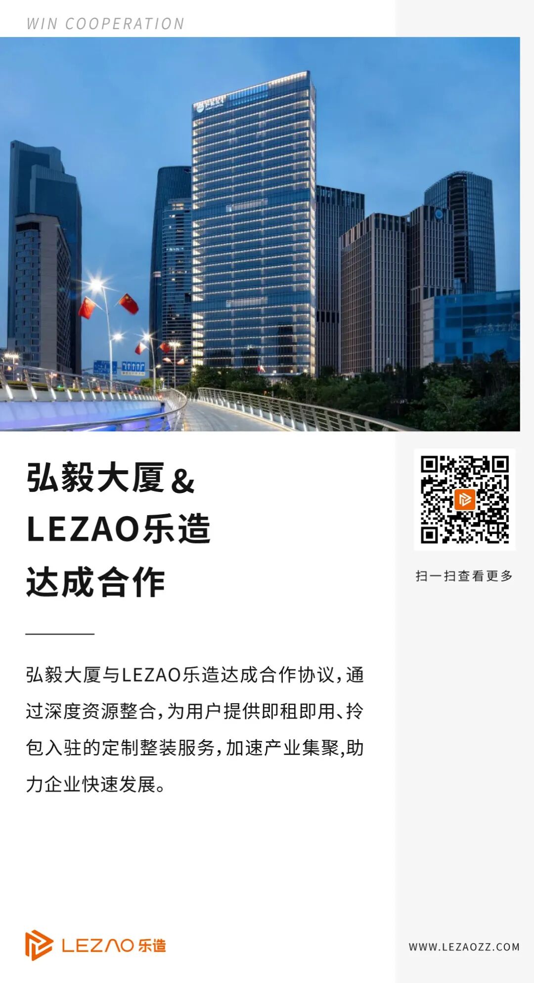 一直以来,LEZAO乐造致力于打造极致性价比的一站式办公整装服务,与优质伙伴合作,构建整装行业新生态。此次,弘毅大厦与LEZAO乐造达成合作协议,旨在通过深度资源整合,为用户提供即租即用、拎包入驻的定制整装服务,加速产业集聚发展。