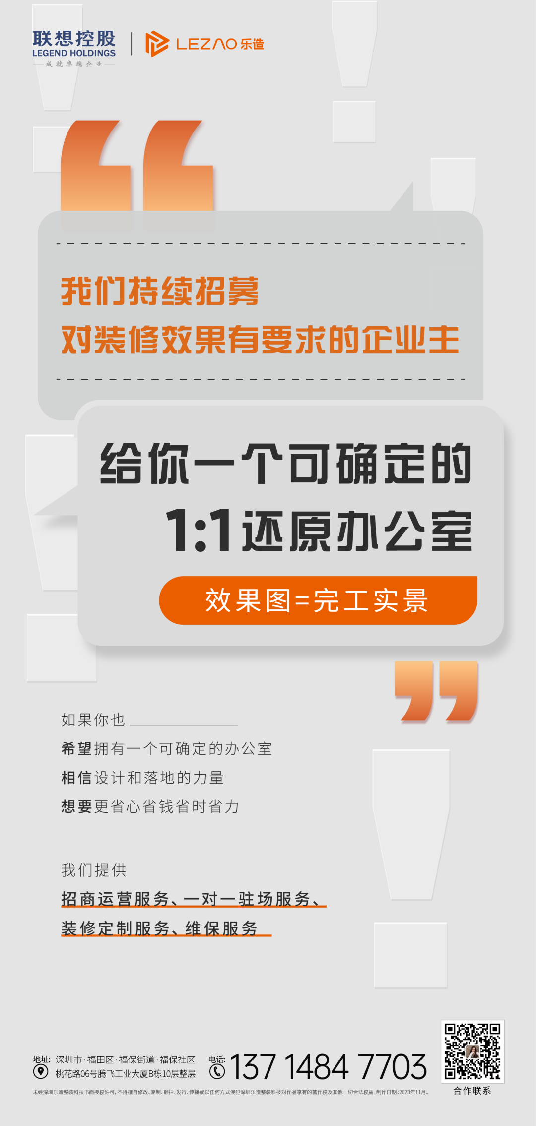 随着嘉宾陆续到场落座,主持人宣布“慧聚联想 礼致群英”联想大厦渠道代理专场交流会正式开始。首先,深圳市联想科技园有限公司总经理宋松青先生发表致辞。 宋总介绍道:联想大厦是联想集团在华南地区办公、研发及业务管理的首个中心,也是南山科技园标志性总部大楼之一。谈及打造理念,宋总表示当初建楼只有一个用途:自用,因此也只有一个追求:舒服。 在这个充满浮躁和焦虑情绪的时代,联想大厦正因为做到了真正契合时代和业主的需求,才能二十多年来一直满租,用低密度、高绿化率换取一线城市难能可贵的舒适感,希望能给贡献智慧力量的高新技术企业及人才,提供更加舒服、更加幸福的绿色生态办公空间。 而后,CBRE联想大厦项目招商负责人Jason为在场的所有合作伙伴分享了联想大厦的打造亮点及最新商务条件,让每一位嘉宾对联想大厦都有更加深入的了解。 项目地处深南大道旁,约半小时快速通达福田CBD、宝安机场、蛇口码头、深圳北站等深圳枢纽地段,临近1号线高新园站/深大站、9号线粤海门站、13号线深大站/粤海门站(即将开通),交通便捷。 另外,联想大厦配备空中生态绿洲台地式户外花园、多功能高阔中庭、低密度硅谷式办公环境、至尊物业服务体验、全方位品质商业配套、多功能共享会议室等,满足高新企业各项商务办公、社交、休闲、培训需求。 在参观卓尔空间环节,LEZAO乐造用户发展部经理向与会伙伴介绍此次携手联想大厦打造的办公空间,乐造充分考虑联想大厦楼宇特点,开发出一系列适配的一站式拎包入驻、即租即用装配式空间整装方案,结合大厦自身拥有的各项完善配套资源,为用户带来最具性价比的一站式办公整装服务。 在空间上通过合理的秩序化设计,给人以实力、专业、用心三重感受,空间视觉上加强形式感的设计外,在整体面积分配上也精心考虑,动线和空间功能合理布局,以便捷有序的使用空间来提高工作效率,以多样性空间需求和人性化设计为出发点打造个性化复合式的办公空间。 联想大厦配备的空中生态绿洲台地式户外花园,支起天幕,轻松惬意的露营感在写字楼里触手可得。 户型展示区,LEZAO乐造根据为联想大厦打造的整装产品方案,设计出不同户型的平面布局及交付效果VR展示,每一步服务都走在用户需求之前,供用户之所需,用极致专业服务,解决客户装修烦恼,提供超预期的价值。 不知不觉间,活动已然接近尾声,工作人员为各位嘉宾发放精心准备的伴手礼。通过这次交流会多维度的分享与深入探讨,与会的渠道代理合作伙伴纷纷表示对联想大厦助力企业创新引领的发展满怀信心和期待。未来,LEZAO乐造、联想大厦与渠道代理合作伙伴将携手同行,共赢展现新价值,深度赋能企业发展!